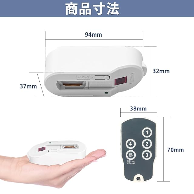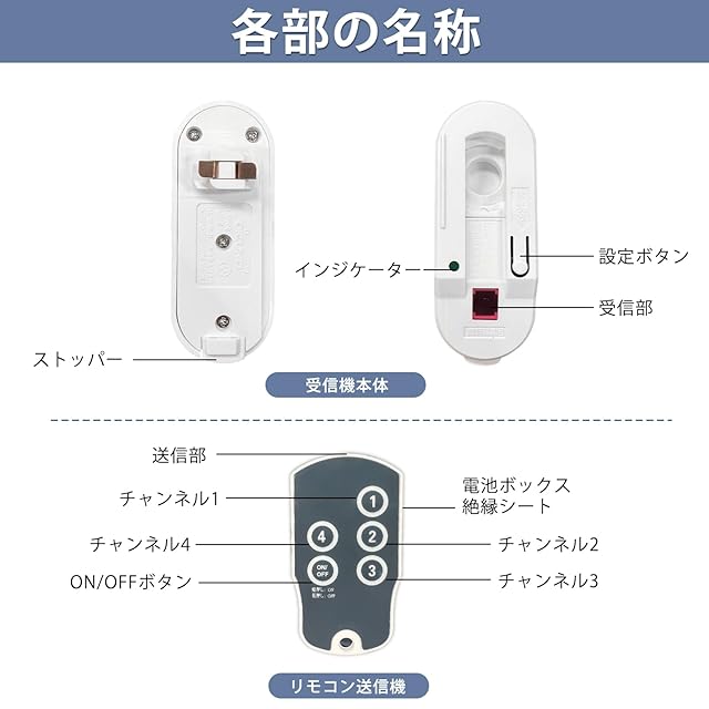 【受信機本体】定格電圧:100V 50Hz/60Hz、定格容量:1A、使用可能電球:白熱電球60Wまで、蛍光灯/LED電球15Wまで、耐荷重:2KGまで