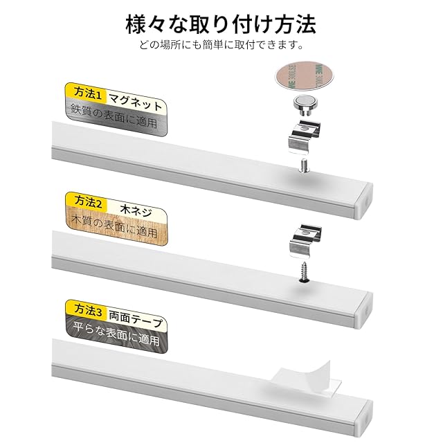 【強力マグネット/両面テープ取付】強力マグネットと両面テープ付きます。工事不要、どこでも簡単に取り付けられできます。 インテリア、ガレージ、廊下、足元、天井、シーリング、カーポート、納戸、浴室、洗面所、洗面台、部屋、物置、倉庫、リビング、などに設置して活躍します。