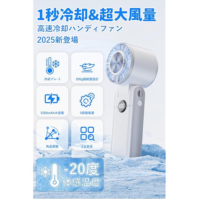 【2025新登場 -20℃瞬間冷却】 ハンディファン 冷却プレート搭載 5200mAh大容量 18.5h連続使用 携帯扇風機 強力送風 5段階風量調節 小型 クーラー機能 軽量 静音 7枚羽根 LEDディスプレイ 熱中症対策 ストラップ付き 万博 スポーツ観戦 花火大会 オフィス アウトドア (ホワイト)