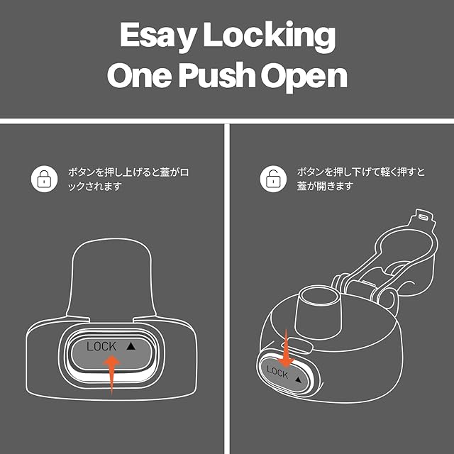 【ワンタッチ ロック付きフタ】水筒のボタンを押すだけで素早く開閉でき、ロック機能でしっかり密閉され、漏れの心配がありません。いつでもどこでも簡単に水分補給が可能です。