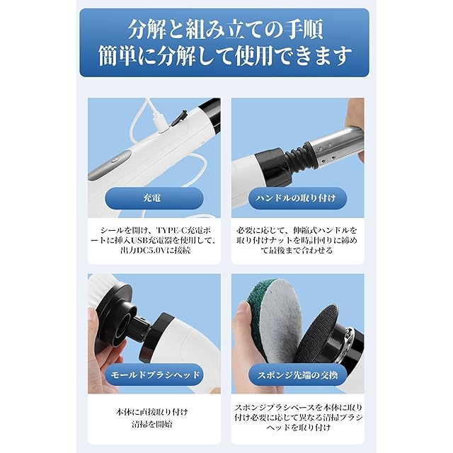 【家中まるごとお風呂掃除感覚で対応】フラット・コーナー・スポンジ・羊毛・布・繊維など多様なブラシで、お風呂掃除だけでなく、洗面台・トイレ・キッチン・車内・窓ガラスまで幅広く活躍。コードレス&急速充電で、いつでもどこでも頼れるお風呂掃除パートナーです。