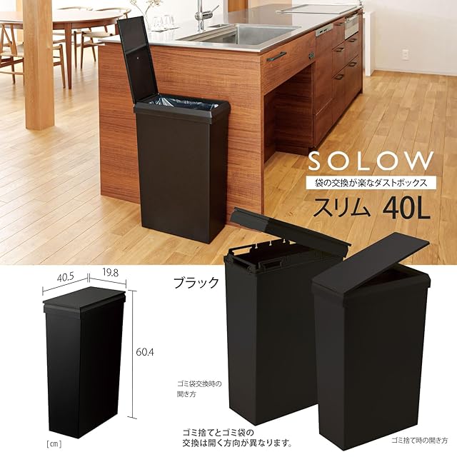 リス(Risu) 蓋付きゴミ箱 SOLOW 袋の交換が楽なダストボックス スリム ブラック 40L 日本製 キャスター付き 防汚加工 分別対応 便利 シンプル おしゃれ 使いやすい リビング 棚下 キッチン トラッシュボックス ちり箱 GSLW015