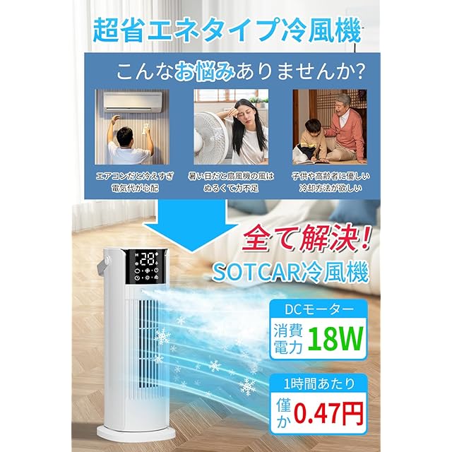【18wで省エネ・スリムタワー型・持運ラクラク】電気会社の料金単価が31円/kWhの場合、1時間あたりの電気代の目安は0.47円!消費電力の小さい製品ほど省エネ性が高く、電気代を抑えられます!重量は僅か1.45kg、革製取ってもつきますので、女性や高齢者でも持ち運びやすい!タワー型デザインでスペースを取らず、キッチン、オフィス、寝室、自宅、エアコンを設置できないところなどさまざまな場所に大活躍できます。送風口が細長く、立ち仕事をしながら涼みたい場合に便利です。お買上げから、一年間品質を致しております。ご購入後、不具合が発生した場合は、無料交換で対応させて頂きます。ご使用中に、何か問題がございましたら、お気軽に弊社までご連絡ください。