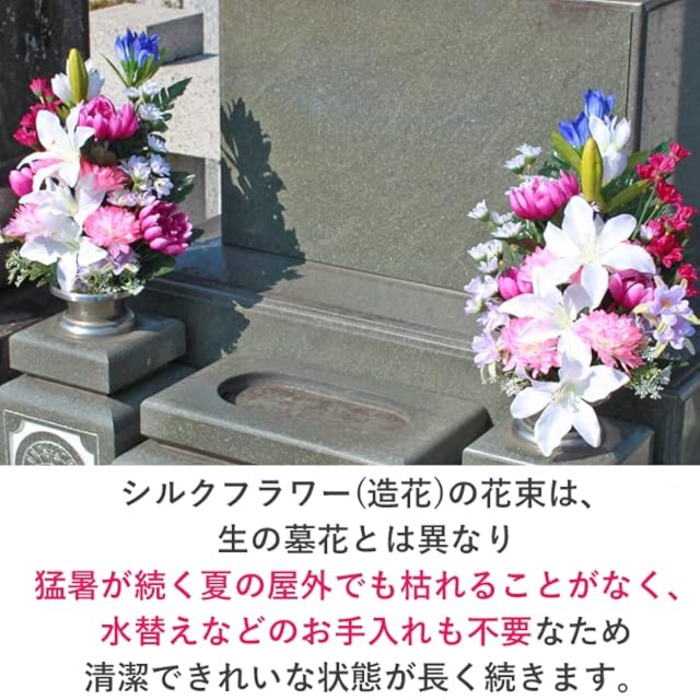 シルクフラワー(造花)の花束は、生の墓花とは異なり、猛暑が続く夏の屋外でも枯れることがなく、水替えなどのお手入れも不要で清潔できれいな状態が長く続きます。
