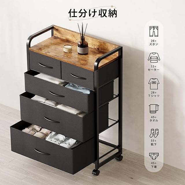 YeTom チェスト タンス 箪笥 洋服タンス 洋服収納 4段収納 引き出し 収納 たんす 衣類収納 ファブリックチェスト リビング 収納 木製天板付き 和風 布製引き出し 転倒防止 安定感 ストッパー付きキャスター L55×W29×H96cm (4段5杯 ピンテージ)