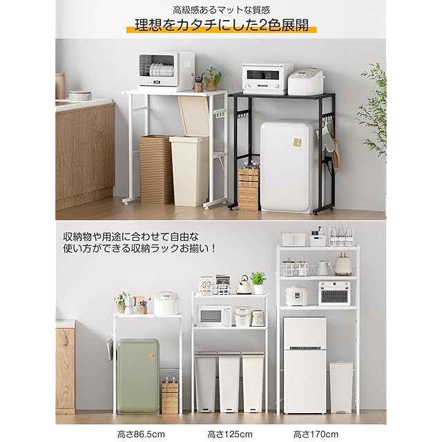 商品名:TKUIN ゴミ箱上ラック レンジラック 幅40-60×奥行46×高さ86.5cm 耐荷重40Kg キッチンラック 作業台 スチール 伸縮式 レンジ台 冷蔵庫上収納 レンジ下収納 フック8個付 (White)