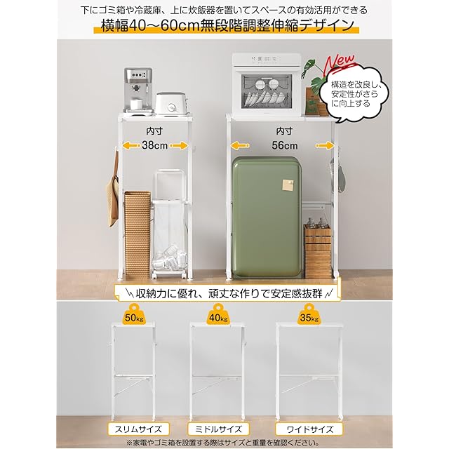 【横幅40~60cm伸縮可能ペダルペール上ラック】空間、収納物に合わせて調節できる無段階伸縮機能ジャストサイズに。広げてお使いいただく場合はトースターとポットなどキッチン家電を並べることができ、狭ると家具の隙間に設置したり、空間にフィットする機能になっています。伸縮式で下に約1~2個のゴミ箱、小型冷蔵庫を置くことができます。スペースに合わせて幅を伸縮できるので作業台横のスペースもムダになりません。