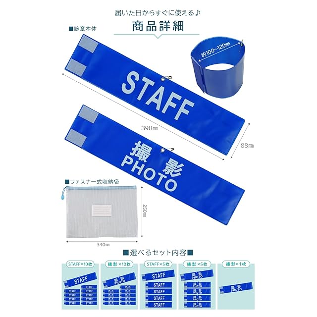 【セミナーや展示会、地域のイベントで大活躍!】皆様に選ばれ続けている腕章セットです!業務用からちょっとした地域イベントまで! 「STAFF」の文字入り、保管用の収納袋つきでこれさえあればすぐに使えるセット商品です!腕章はマジックテープで簡単装着。固定用ピンの固定も可能!腕章を使わないときの保管や持ち運びを考慮して収納用の保管袋を準備しました。 【「STAFF」の文字入りの腕章で商品が届いたらすぐに使用できます。】マジックテープで簡単につけることが可能です。 ずれ落ちが心配な方は固定用ピンを使って確実に 固定できます。 【雨の日も安心の防水仕様の腕章です。】腕章本体は防水仕様のため天候に関係なく使用が可能です。 【未使用時の保管や持ち運びを考慮しました。】保管用の収納袋で腕章の整理も簡単にできます。 また収納袋は名札つきで中身がわかる仕様になっています。 【用途に合わせて腕章の枚数をお選びいただけます】1枚、5枚、10枚と用途に合わせて必要枚数をお選びください。 【商品仕様】・腕章本体 ・保管用収納袋
