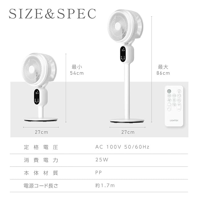 【製品仕様】本体サイズ:W27×H27×D86cm / カラー:ホワイト / 材質:PP / 風量調節:12段 / 重量:約2.8kg /日本語取扱説明書*1。日本電気安全利用法よりPSE認証を獲得して、利用中更に安心安全です。また、本製品は1年が付いておりますので、安心してご使用いただけます。ご利用中、何かご不明な点や質問がございましたら、お手数ですがご連絡ください:「注文歴史」-「該当注文」-「出品者に連絡する」。