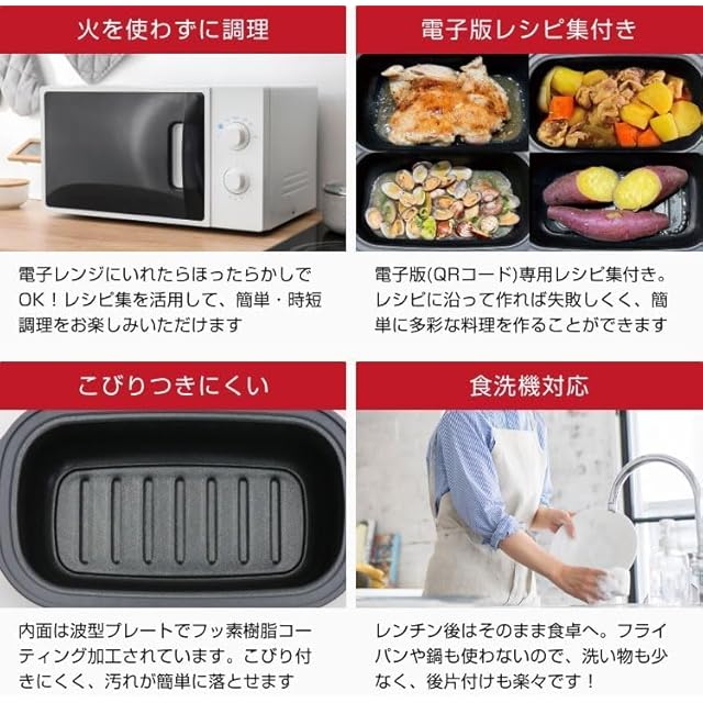 電子レンジに入れるだけで魚料理や肉料理、ご飯、パスタまで作れる1台6役のレンジ調理器です。QRコードから閲覧できるレシピが付いています。焼く、炒める、煮る、蒸す、炊く、温め直すを鍋や火を使わずに簡単調理!