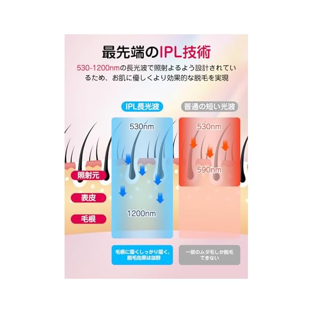 IPL光脱毛器・先端サファイア冷感:IPL脱毛はIPL光の力を使って効果的にムダ毛ケアをします。本製品はIPL(インテンス・パルス・ライト)という特殊な波長の光をお肌に照射します。毛包(ムダ毛の根本)にあるメラニン色素がPL光のエネルギーを吸収し、毛包に効果的に温熱作用を及ぼします。サファイア結晶は高強度、耐高温、高透過性などの貴重な物理性能があり、半導体冷却技術と結合して、安全で快適な冷感無痛脱毛を実現できます。