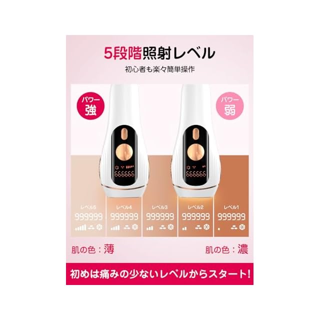 5段階調節・家庭用99万発照射:本脱毛器は5段階照射レベルがあります。説明書のカラーチャートを参照に、ご自分の肌色に合う照射レベルで使うのはより快適な脱毛体験を楽しめます。99万照射回数があり、一人での使用なら、40年以上が使用できます。家族や友人と一緒に使用することもでき、家族には1つで十分です。