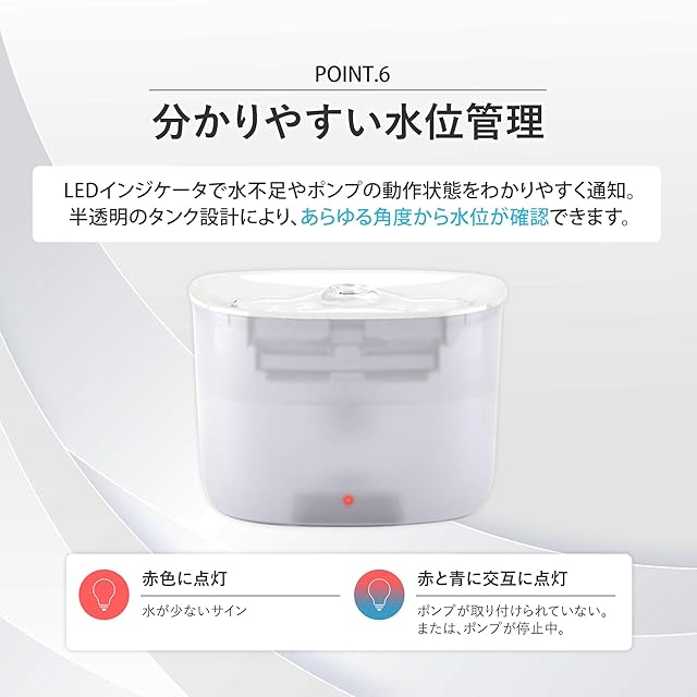 【水不足やエラーをLEDでお知らせ】水位センサーで水が不足すると自動的に運転を停止するのでポンプの破損などエラーを防止できます。水が少なくなると赤に点灯、ポンプのエラーで赤・青交互に点灯します。 またアプリ設定でスマートフォンへ通知できるので、外出先からでも通知を受けたり確認することができます。