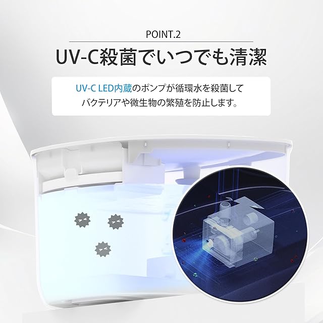【いつでも清潔なお水を供給できるので安心安全】浄水に特化した特殊素材を使用しており不純物や残留塩素を除去するので清潔で安全な水を供給することができます。 また、UV-C LED内蔵のポンプが循環水を殺菌してバクテリアや微生物の繁殖を防ぎます。 フィルター・ポンプ用フィルターのフォームは各1個内蔵していますが、1ヶ月に1度の交換をおすすめします。(別売りフィルターは、専用フィルター・ポンプ用フィルターのフォーム各2個セット、各6個セットでの販売です)