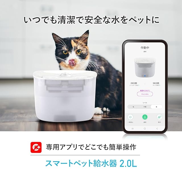 夜間でも安心の静音設計で、いつでも清潔で安全なお水を供給することができる大容量2.0Lのペット用給水器です。お手入れ簡単で、電源部分が水に触れることがない設計なので安全です。水量や給水モードを専用のアプリでどこからでも簡単に制御することができて給水器の動作状況をリアルタイムで確認することができます。