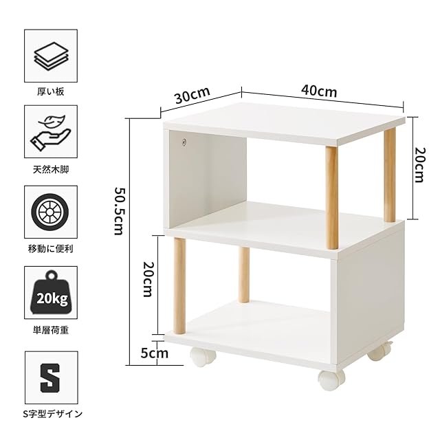 商品名:Aibiju サイドテーブル キャスター付き ベッドサイドテーブル 3段 移働に便利 小さい 棚 オープンシェルフ スリム ベッド横 ソファ 寝室 収納棚 おしゃれ 白/木の色 YD-TM155W