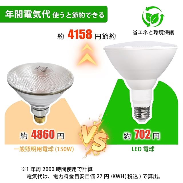 【特徴】 ・IP65の防水等級で屋内外どちらでも使用可能 ・PAR38 LEDを使用して従来のビーム球を完全再現 ・工場・倉庫などに最適なスポット照明や看板照明に適用可能 ・約80%の消費電力カットにより、省エネもできる長寿命タイプ ・有害物質やUV放射がなく安心して使用できます ・バラストレス水銀ランプに比べ、交換作業も大幅に省けます このLED電球は、IP65の防水等級を備えているため、屋内外問わず使用することができます。PAR38 LEDを使用することで、従来のビーム球を完全再現し、工場や倉庫などのスポット照明や看板照明に最適です。また、従来の白熱電球に比べて電力消費を約80%もカットし、40,000時間の長寿命により維持費を大幅に削減することもできます。また、有害物質やUV放射がなく、安心して使用することができます。更に、バラストレス水銀ランプに比べ、交換作業も大幅に省けます。