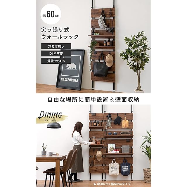 萩原(Hagihara) 突っ張り ラック つっぱり 棚 壁面収納 ウォールラック 【DIY・穴あけ・工事が不要】簡単取付 段差対応 木目調 幅60 スリム ブラウン KTR-3147BB
