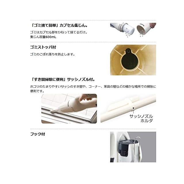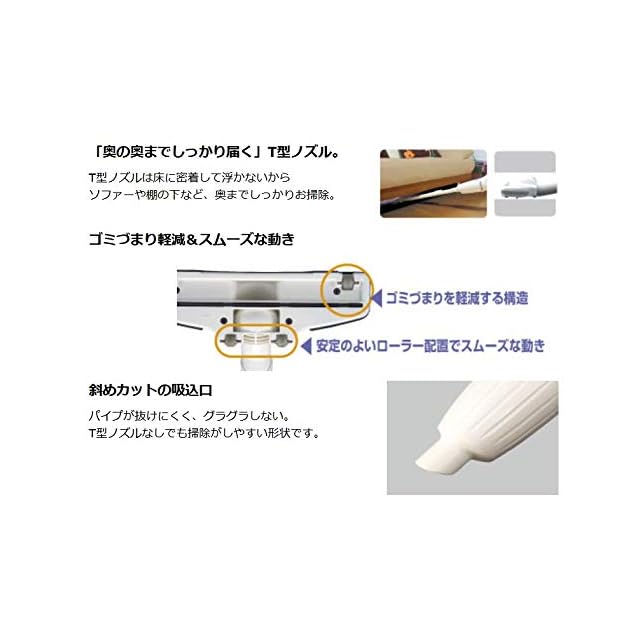 収納に便利なフック付、パワフルな吸引力、奥の奥まで届くT型ノズル、斜めカットの吸込口、ゴミストッパ付