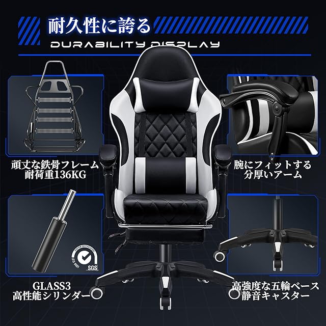 「135°リクライニング強い安定感」最大135°調節、チェア本体の安定性を高めると同時にリラックス効果を最大限に活かす。連動式アームレストと格納式オットマンに合わせて、全身を一所も逃さず支えて、最高なリラックスを提供する。格納式オットマンは使わない時は座面下に収納可能、省スペースで利便である。ざまざまな工夫で、作業とゲームプレイの姿勢や動きの変化、体格に応じて最適なサポートを実現している。オフィスでの休憩や仮眠にもおすすめのゲーミングチェアです。