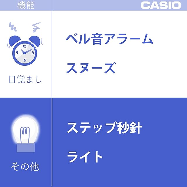 機能:ベル音アラーム、スヌーズ機能、ライト、ステップ秒針