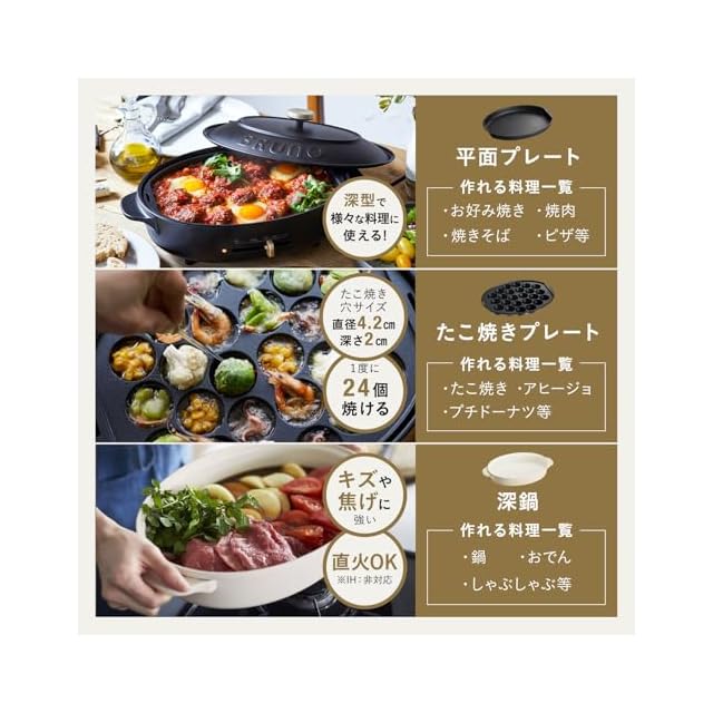 BRUNO ブルーノ オーバルホットプレート 本体 プレート3種 (たこ焼き 深鍋 平面) グレージュ Greige おしゃれ かわいい これ1台 一台 蓋 ふた付き 1200w 温度調節 洗いやすい 1人 2人 3人用 小型 ひとり暮らし にも BOE053-GRG