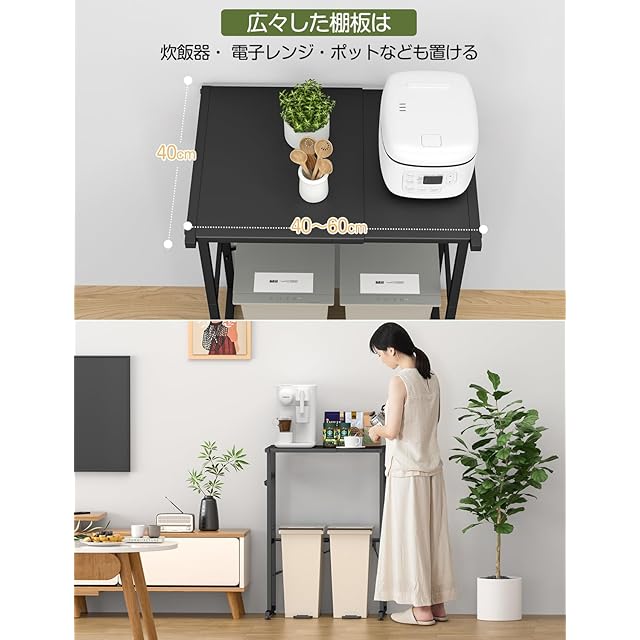 【高さ84.5cm以下のフタ付き・ペタル式・分別ごみ箱2個に適用】ペタル式や蓋つきのゴミ箱も開けた高さは84.5cm以下であれば、ゴミ箱の蓋がラックの天板に当たることなく快適にご使用いただけます。(※ご使用予定のゴミ箱のサイズをあらかじめご確認ください。)伸縮式で横幅が40~60cmの間にねじを回しだけ調整することで、分別用ゴミ箱2個が並べても置けます。ゴミ箱やワゴンを置ける棚下スペース、デットスペースの有効利用、無駄のない空間活用で充実のキッチンライフへ。