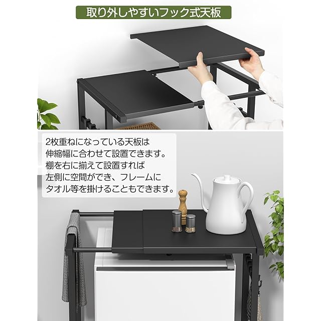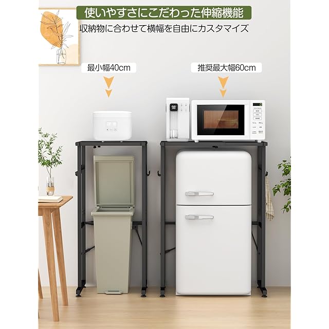 商品名:Holdm ゴミ箱上ラック レンジラック スチール 伸縮 40-60×奥行40×高さ86.5cm 耐荷重25㎏ フック8個付 アジャスター付き レンジ台ラック 冷蔵庫上ラック (ブラック)
