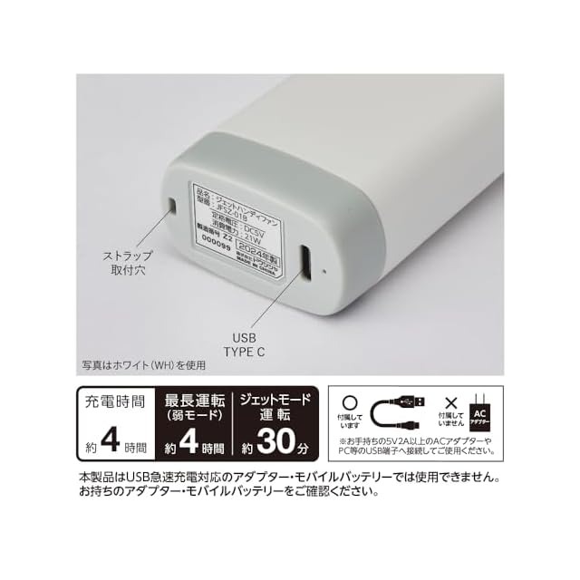 充電時間:約4時間、使用時間 ジェット:約0.5時間、強:約1時間、中:約2時間、弱:約4時間、使用推奨温度:5℃~35℃、USBケーブル長さ:約0.5m