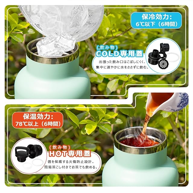 【保温・保冷機能】 このボトルは真空二重構造を採用しており、外気温に左右されにくく、長時間飲み物の温度を保ちます。例えば、6時間後も飲み物が暖かいまま保てる保温機能があり、冷たい飲み物も6時間以上冷たいままキープできます。容量は1000mlで、サイズは8.2×33cmと大容量でありながら、持ち運びやすい設計が魅力です。毎日の通勤や外出時、アウトドア活動など、さまざまなシーンで飲み物を最適な温度で楽しむことができます。