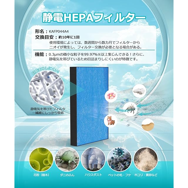 【交換の目安】約10年。空気清浄機をピーク性能で動作させるためには、正しいタイミングにフィルターを交換してください。 ※ご使用の時間や環境により、フィルターの寿命が違います。特にペットちゃんを飼っている家庭では、交換時間を短縮することをお勧めします。