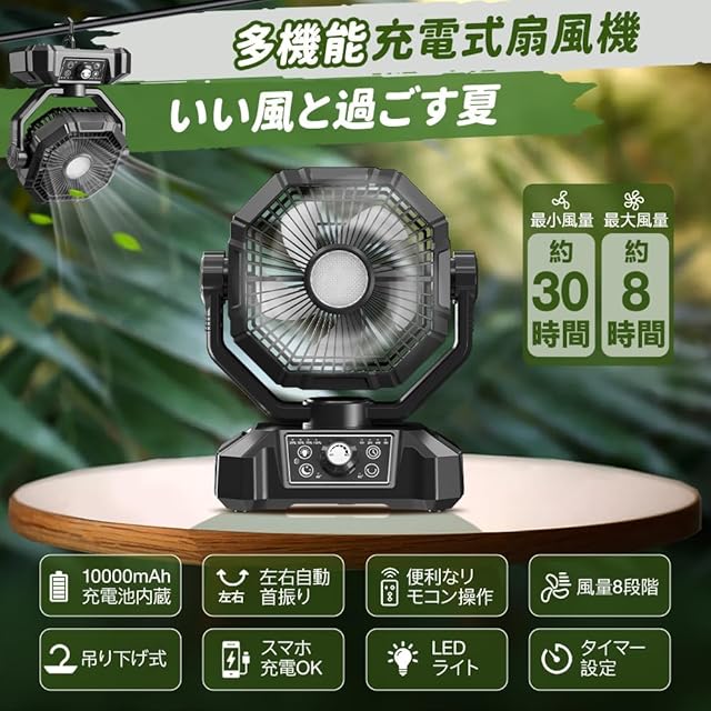 商品名:YUUYOU キャンプ扇風機 【日本企業監修】 節電対策 卓上扇風機 自動首振り 充電式 風量8段階調節 10000mAh充電池 30/65時間連続使用 Type-C充電 モバイルバッテリー機能 多機能ファン 吊り下げ タイマー リモコン付き LEDライト DCモーター 暑さ対策 サーキュレーター 小型 静音 リビング アウトドア 防災 キャンプ用品 テントマット 車中泊 コンパクト 持ち運び便利