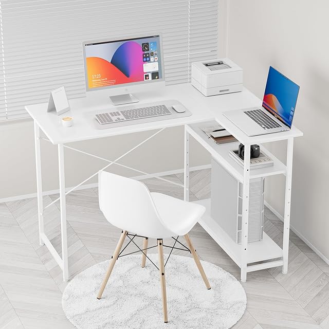 MIYOKI L字デスク パソコン デスク 幅110×奥行48×高さ75cm 左右入替え可能 l字型 コーナー ゲーミング 収納ラック付き 棚板高さ調節可 テレワーク 在宅勤務 学習机 省スペース ワークスペース ラック付き 作業机 シンプル オフィス (ホワイト)