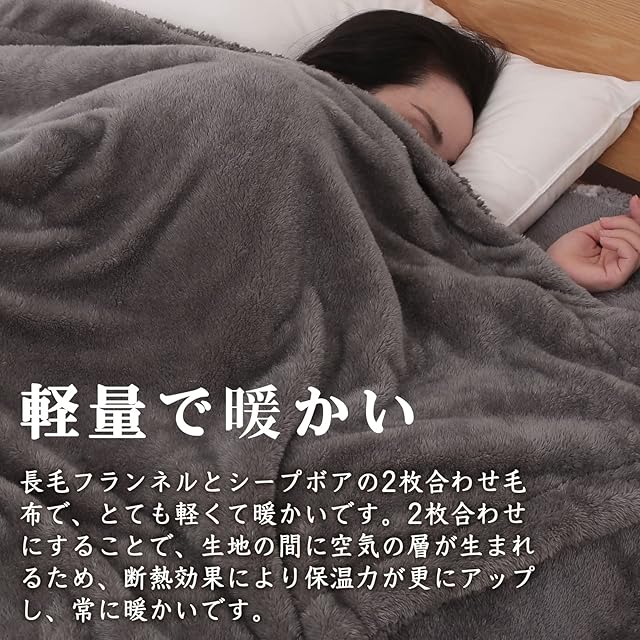 【厚手で暖かい】長毛フランネル&シープボアの二枚合わせ毛布で、普通の一枚毛布より厚いですが、ふんわりながら軽いなので、重たい毛布が苦手の方にオススメします。2枚合わせにすることで、生地と生地の間に空気の層が生まれるため、高い繊維密度で保温性にも優れ、断熱効果により保温力が更にアップし、暖かさをしっかりキープしてくれます。