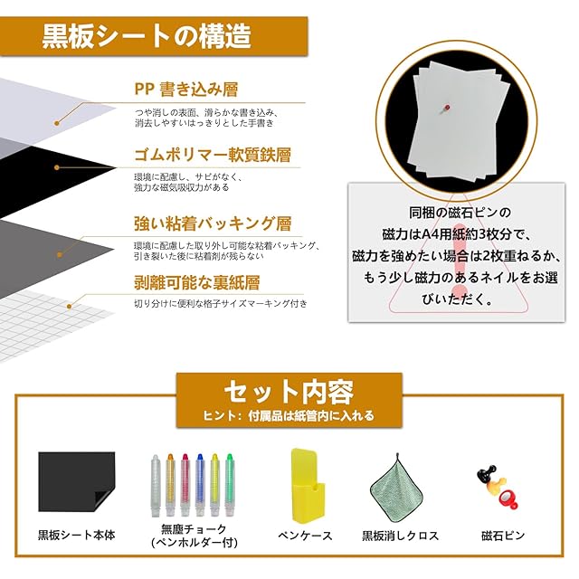 【磁石対応】Putenahotoマグネット黒板紙の表面は磁石に対応しており、マグネットネイルを使ってスケジュールやメモ、写真などを黒板紙に貼り付けられる。磁気を強めたい場合は、黒板紙を2枚重ねて使用するか、より強力なマグネットネイルをご購入ください。