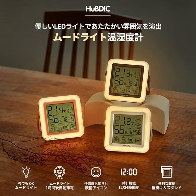 優しいLEDライトで落ち着いた雰囲気を演出! 室内環境のための繊細なムードライト付き温湿度計で、夜間の授乳ライトとしても使えます。