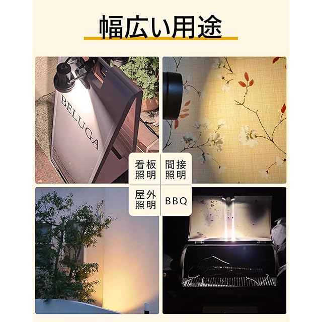 【角度自由調節】アームは360°回転でき、ランプヘッドは270度回転可能。 照明の角度を自由に調整できます。取り付けがクリップタイプなので、何処でも挟んで使えるので移動がとても簡単で、ハイライトとシャドーのメリハリも効果的に作れるので助かります。クリップの挟む力も強い。AC給電で結構明るいので、電力さえ供給できれば、BBQとかお花見とか、キャンプする際や夜釣、屋外の看板、庭の間接照明とか。