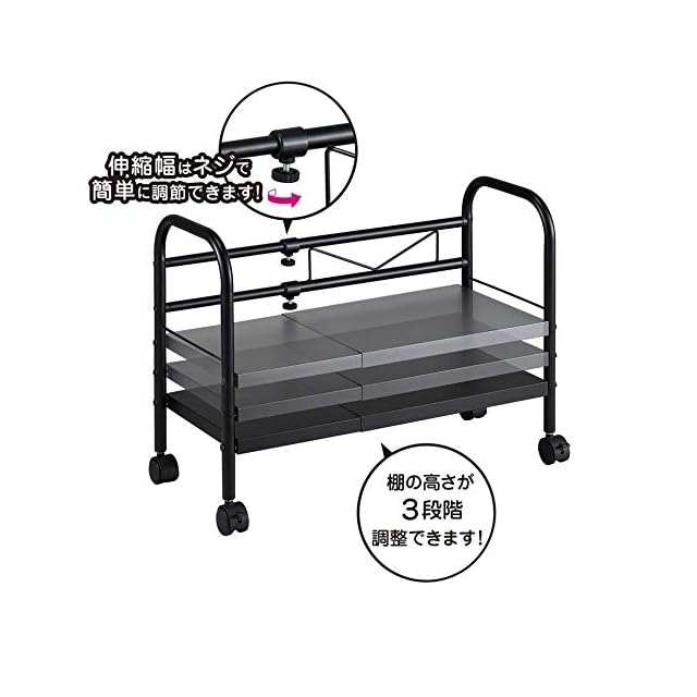 棚板の高さは3段階調節可能で、移動ラクラクキャスター付き。