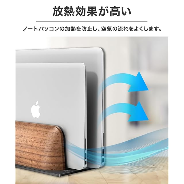 【 冷却効果とデバイス保護 】縦置きにすることで接地面が少ななり、ノートパソコンクーラーとして放熱効果が期待でき、長時間の使用でも過熱を防ぎます。さらに、ウォルナット材のパネルには傷防止パッドが付いており、アルミニウムパネルにはシリコンパッドが装備されているため、デバイスを傷や損傷からしっかりと守ります。