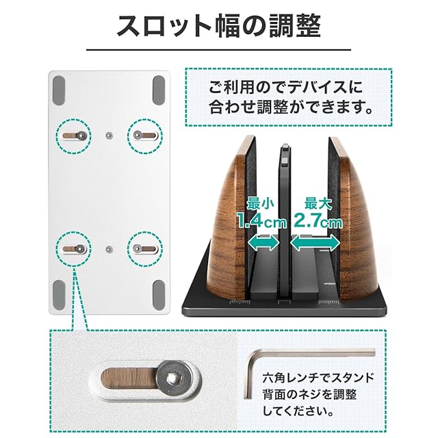 【製品仕様】<BR> 素材:アルミニウム合金+無垢材<BR> 21.5x10.5x8cm <BR> スロット数: 2<BR> スロット調整幅: 1.4~2.7cm 【対応機種】 MacBook Pro、Surface、Galaxy Book、Lenovo、HP、Dell、Chromebook、ThinkPadなど、多くの17インチまでのコンピューターやiPad、モバイルモニターなどのデバイス