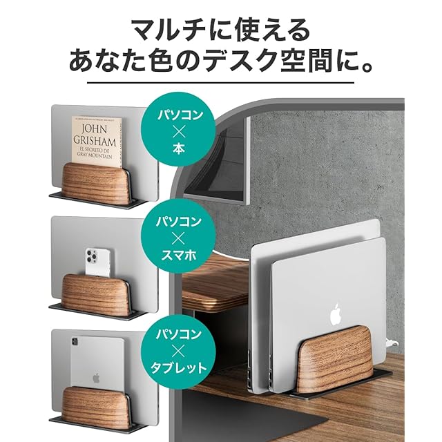 【 縦置き パソコンスタンド 】ブラックウォルナット材とアルミニウムを使用した 2台 対応 縦型 ノートパソコンスタンド。MacBook Pro、Surface、Galaxy Book、Lenovo、HP、Dell、Chromebook、ThinkPadなど、最大17インチまでのノートパソコンやタブレットに対応。自然な素材とアルミニウムの豊かさや魅力を組み合わせた、視覚的に美しいデザインです。上質な素材を使用し、仕事を快適で楽しいものにすることをサポートします。