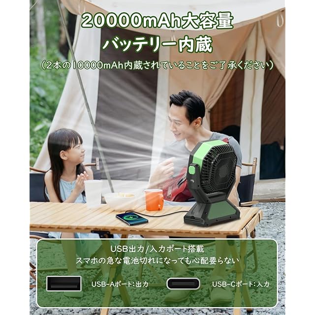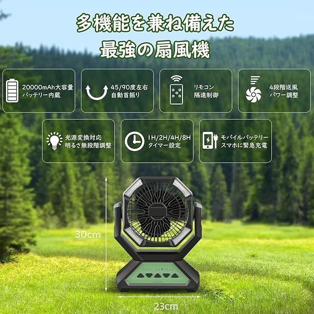商品名:MoKo キャンプ 扇風機 20000mAh充電池内蔵 アウトドアファン Type-C充電式 4段階風量調節 強力送風 自動首振り リモコン付き タイマー設定 静音 卓上/吊り下げ2Way設置 スマホに給電 3色LEDライト 残量表示 暑さ対策 キャンプ用品 夏のキャンプ/釣り/バーベキュー/海辺/火おこし/虫よけ対策/車中泊/災害対策