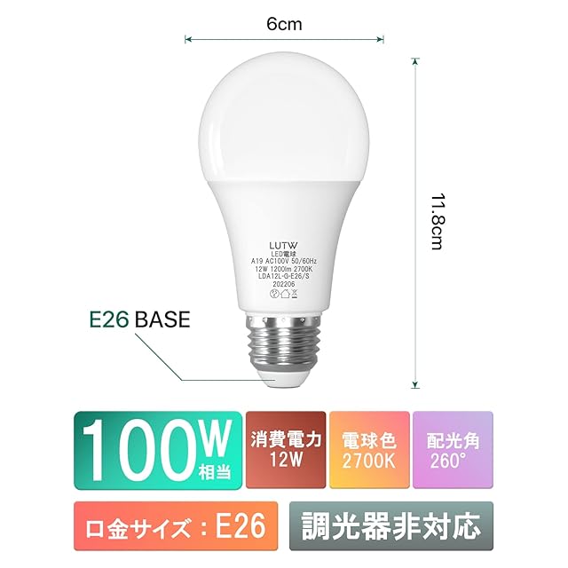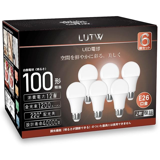 商品名:LUTW LED電球 E26口金 電球色 12W 1200lm 100W相当 2700k 220°広配光 高演色 調光不可 6個入 LDA12L-G-E26