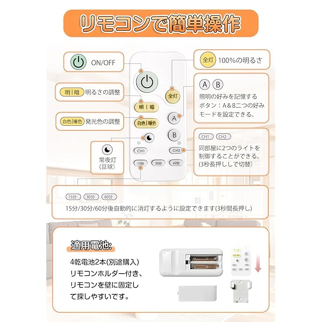 【リモコン付き・無段階調光&調色】LEDシーリングライトは全方位制御できる便利なリモコンが付きます。リモコン操作でライトの明るさと色温度が無段階調整可能です。「明」あるいは「暗」ボタンを押すごとに、ワンランクで明るさを調節できます。2秒以上長押すと、無段階連続調光できます。「全灯」ボタンも搭載、素早く最大輝度に調整できます。「白色」あるいは「暖色」ボタンを押すごとに、ワンランクで色温度を暖色2700Kから寒色6500Kまで幅広く調整できます。2秒以上長押すと、無段階連続調色できます。リモコンホルダー付き、 リモコンを壁に固定して 探しやすいです。リモコン用単四電池*2本別売、予め用意してください。