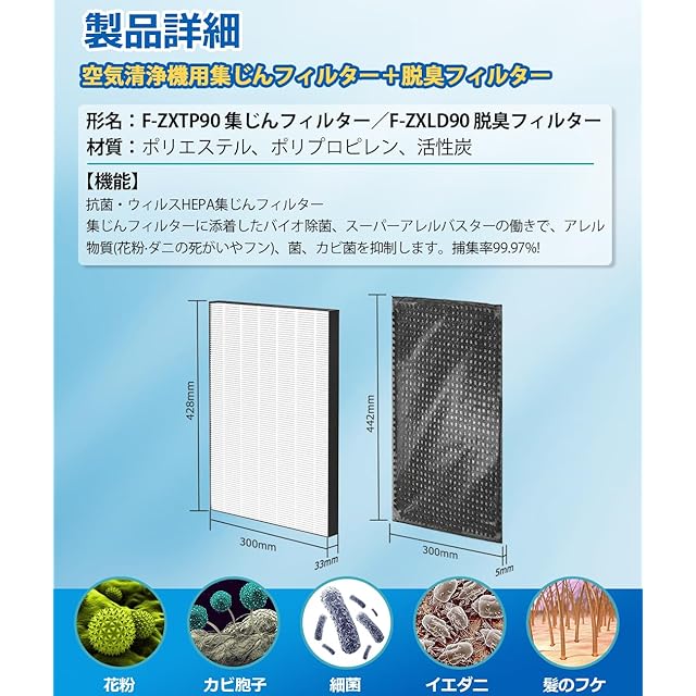 パナソニック F-ZXTP90 用 フィルター F-ZXLD90 脱臭フィルター 集じんフィルター 消耗品セット F-VC70XU F-VC70XV 空気清浄機 フィルター F-VXU70 F-VXU90 F-VXV70 F-VXV90 F-VXW70 F-VC70XT 加湿空気清浄機 互換フィルター