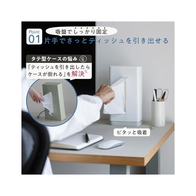 【片手でサッととれるティッシュ】片手で使える縦型のティッシュケースです。マーナ開発のフレキシブルな吸盤「REPITA(リピタ)」を底面に採用。しっかり固定できて、吸盤に触れるだけで簡単に外せます。【ご注意】取り付け面と吸盤部分の汚れ・水分・油分等をキレイに拭き取ってから吸着させてください。