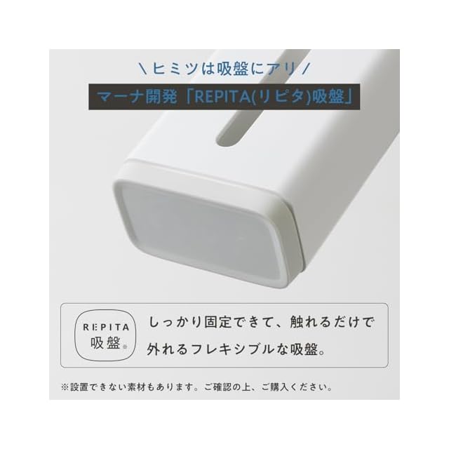 【固定も移動もラクラク】マーナが開発した「RIPITA(リピタ)吸盤」。軽く押し付けるだけでしっかり固定できて、吸着部分に触れるだけで簡単に外せるフレキシブルな吸盤です。【設置できる素材】光沢のある平らな面でステンレス・透明ガラス・金属塗装面等【設置できない素材】凹凸、ザラザラ、艶消し面やコンクリート、コーティングされていない木面等