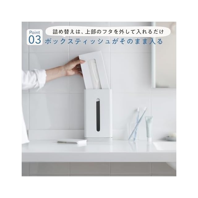 【ボックスティッシュがそのまま入る】詰め替え作業は、上の蓋を外して入れるだけ。ソフトパックティッシュはもちろん、ボックスティッシュやソフトパックのキッチンペーパー、洗顔ペーパータオルなども入ります。(幅11.6cm×高さ24cm×奥行6.6cmまで)