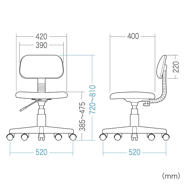 【背もたれサイズ】:W390×H220mm【座面サイズ(座面調節)】:W420×D400×H385~475mm