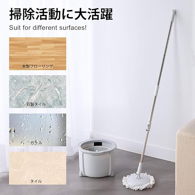 【セット詳細】: 一槽式バケツ1個、クロス2枚、組立必要なハンドル3本、ヘッド1個。<b>【組立簡単】: 手元に到着してすぐ使用したり、モップ本体は軽量で片手でも操作したりできるので、毎日楽に掃除が実現できます。<b>【材質】: クロスの真ん中にはマイクロファイバー、周りには綿糸素材を採用され、柔らかくて吸水性や耐摩耗性等にも優れていて床や壁に優しいし、特に木製の床面を傷つけずキレイに掃除できます。<b>【いいデザイン】: バックルで使用者や掃除場所によりハンドルの長さは調節可能で腰を大変に曲げる必要なくお気軽に使用できます。バケツを分解して底部を洗うことができます。<b>【収納便利】: 一槽式バケツは二槽式よりコンパクトです。またお掃除が終わった後、お邪魔にならずモップを分解してバケツに入れて収納することができます。<b>【品質】: 本製品につきまして、ご不明点やご質問がございましたら、是非こちらのカスタマサービスまで、ご連絡を頂けると迅速に対応致します。お客様にご満足頂けるよう精一杯対応いたします。もし不良品あれば無償で良品と交換させていただきますので、ご安心ください。<b>*【注意事項】:モップの洗浄や脱水が順調に進めるため、洗浄や脱水時、ハンドルは必ずバケツと90°真っ直ぐに置いてください。傾けて操作する場合は、洗浄や脱水時、モップヘッドが回転軸から脱落する可能性もあって、高速回転のスピード、洗浄や脱水の効果にも影響がありますので、予めご了承下さい。